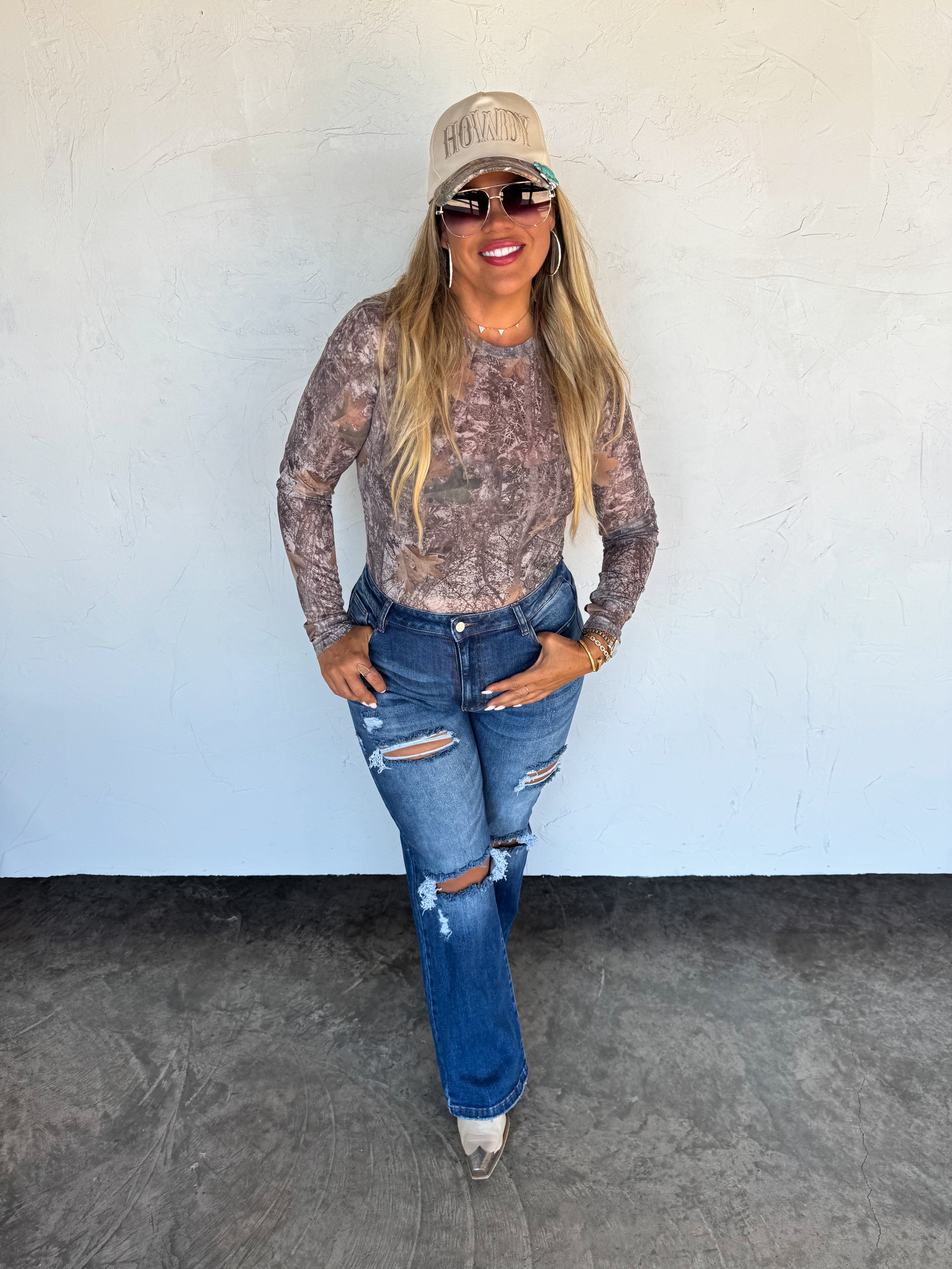Our new camo tops are HERE!!! Stretchy mesh print long-sleeve top features a totally sheer design. Perfect for layering or worn alone. Pairs great under graphic tees or Cardigans too! Crew neck and thumbhole details sleeves.
