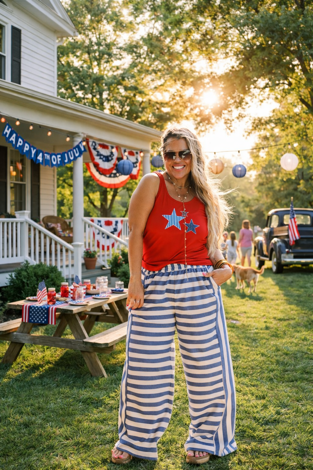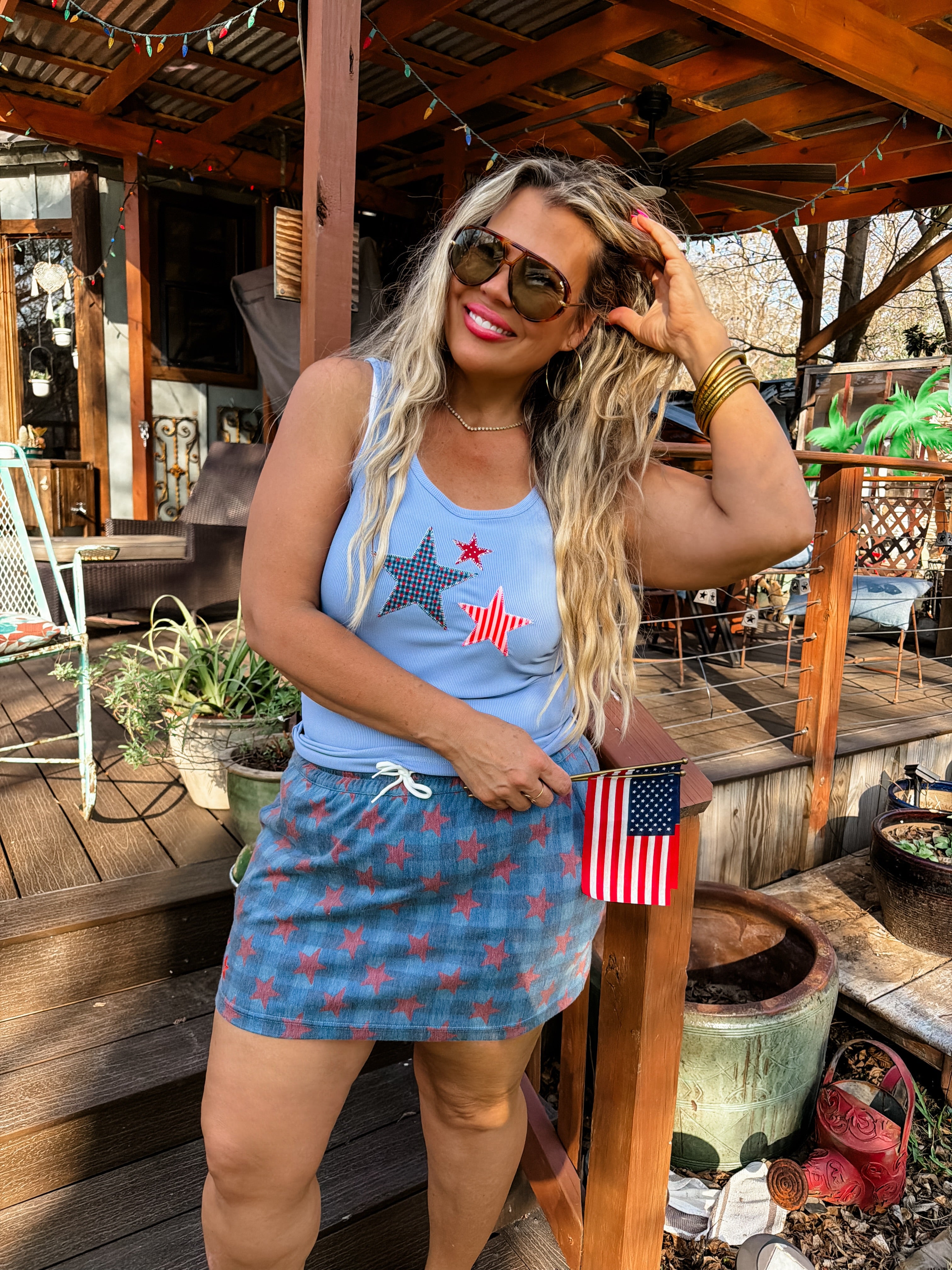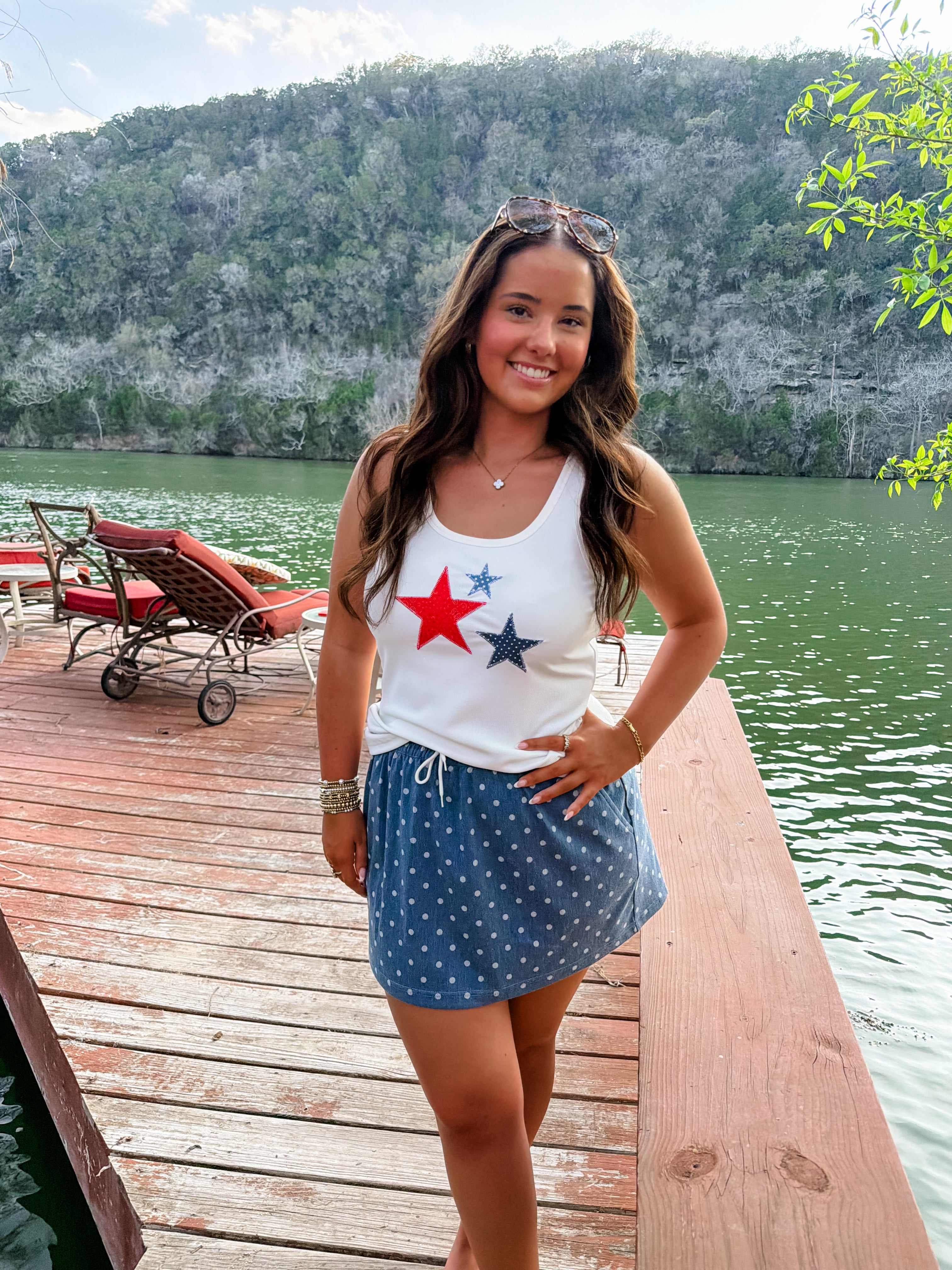 The perfect stretchy ribbed tank in our same popular "Cameron" style tank! Embellished with printed patch stars, this tank is so cute for Summer!