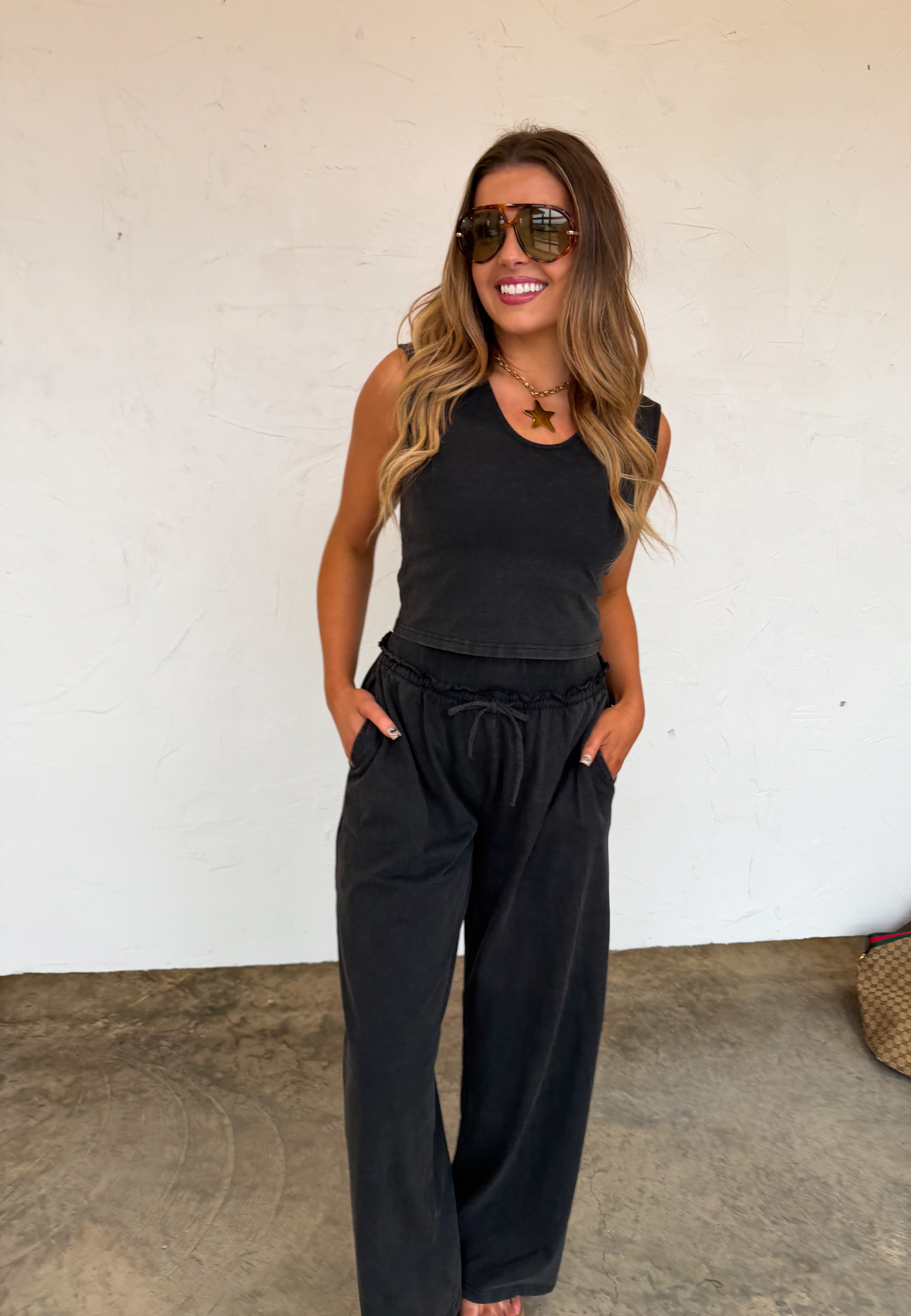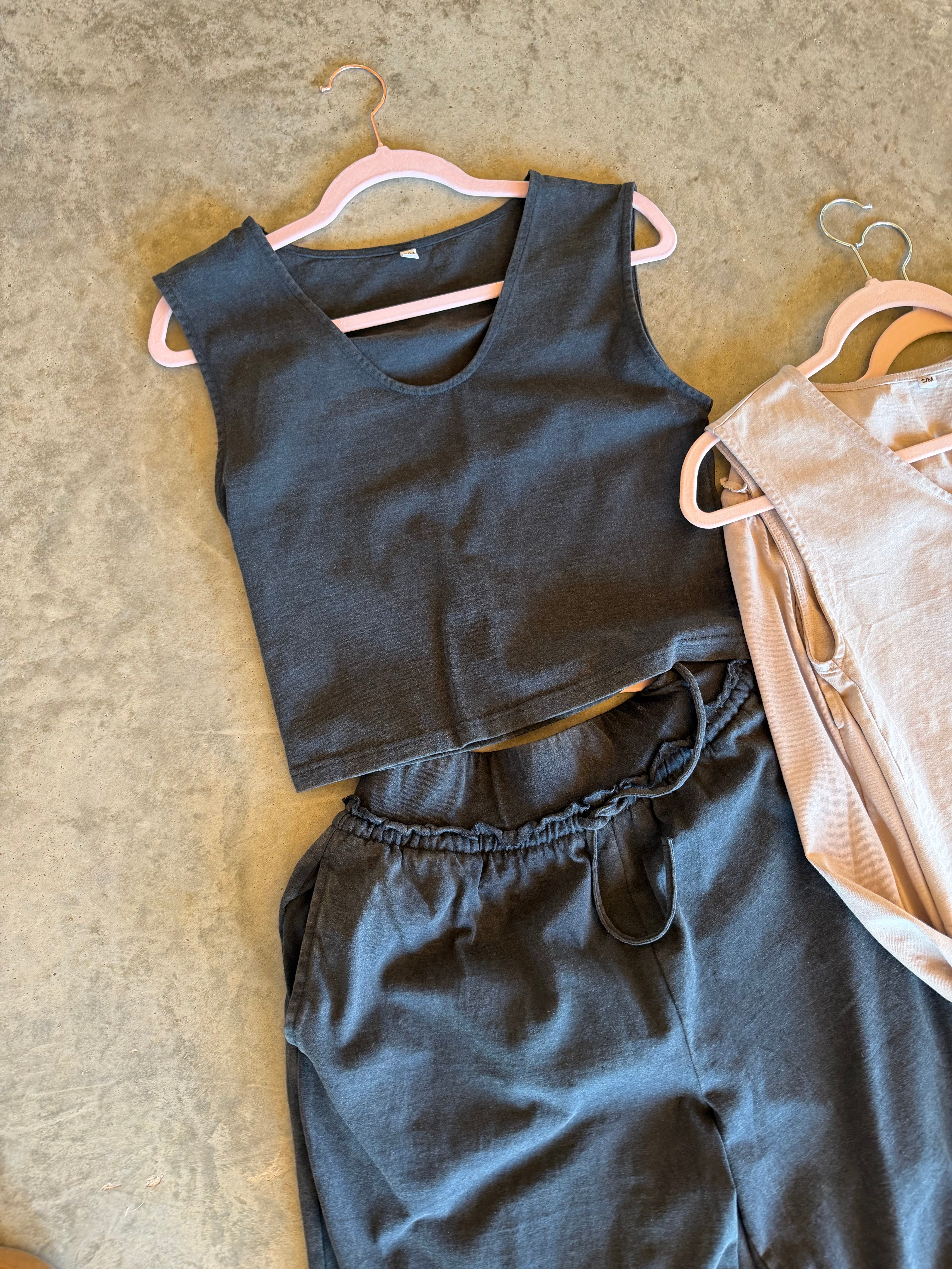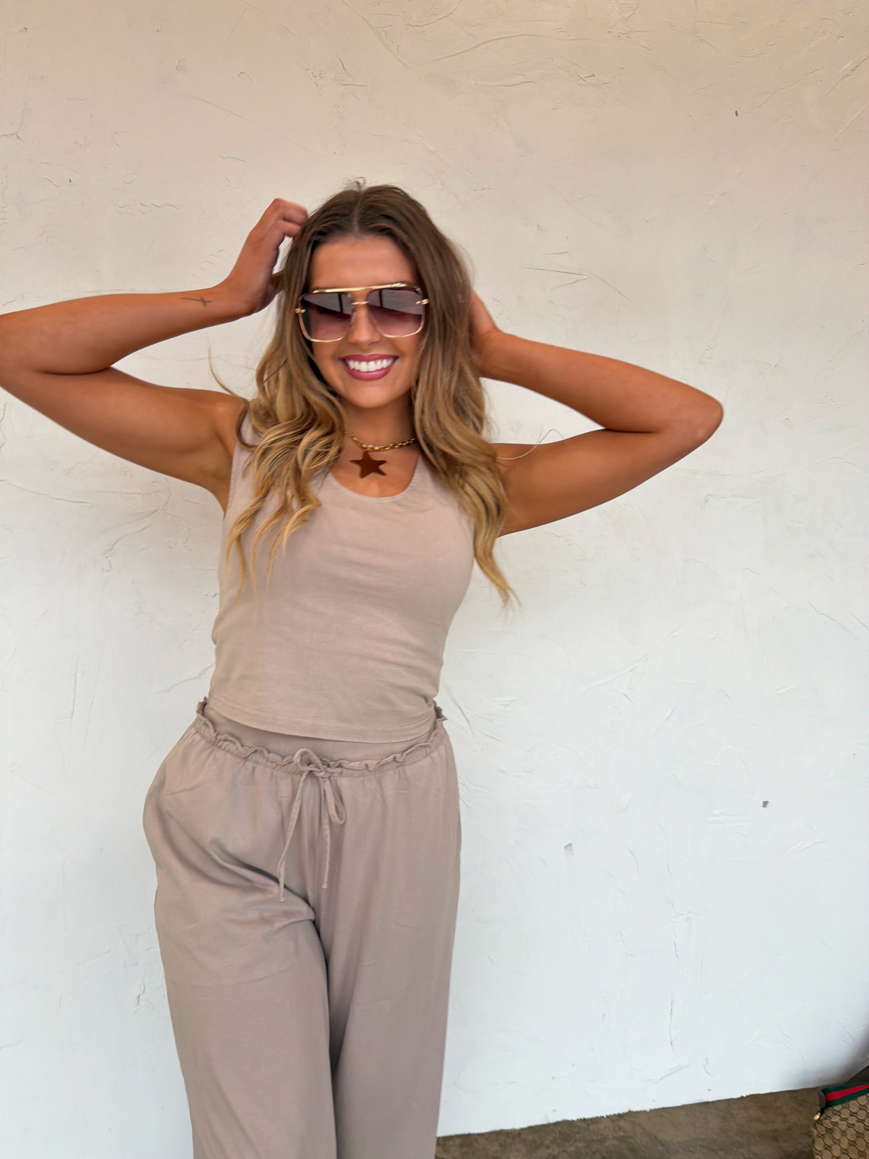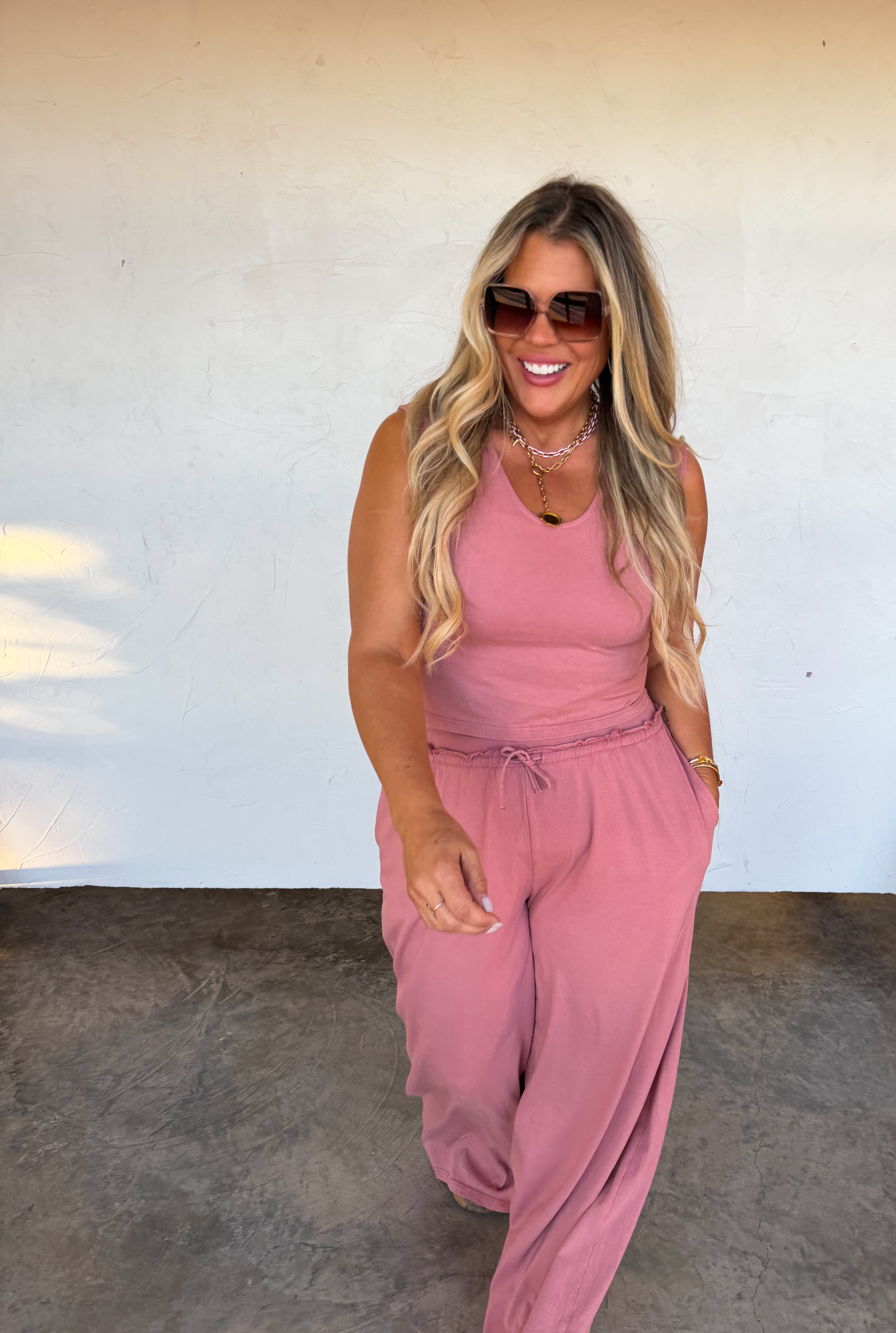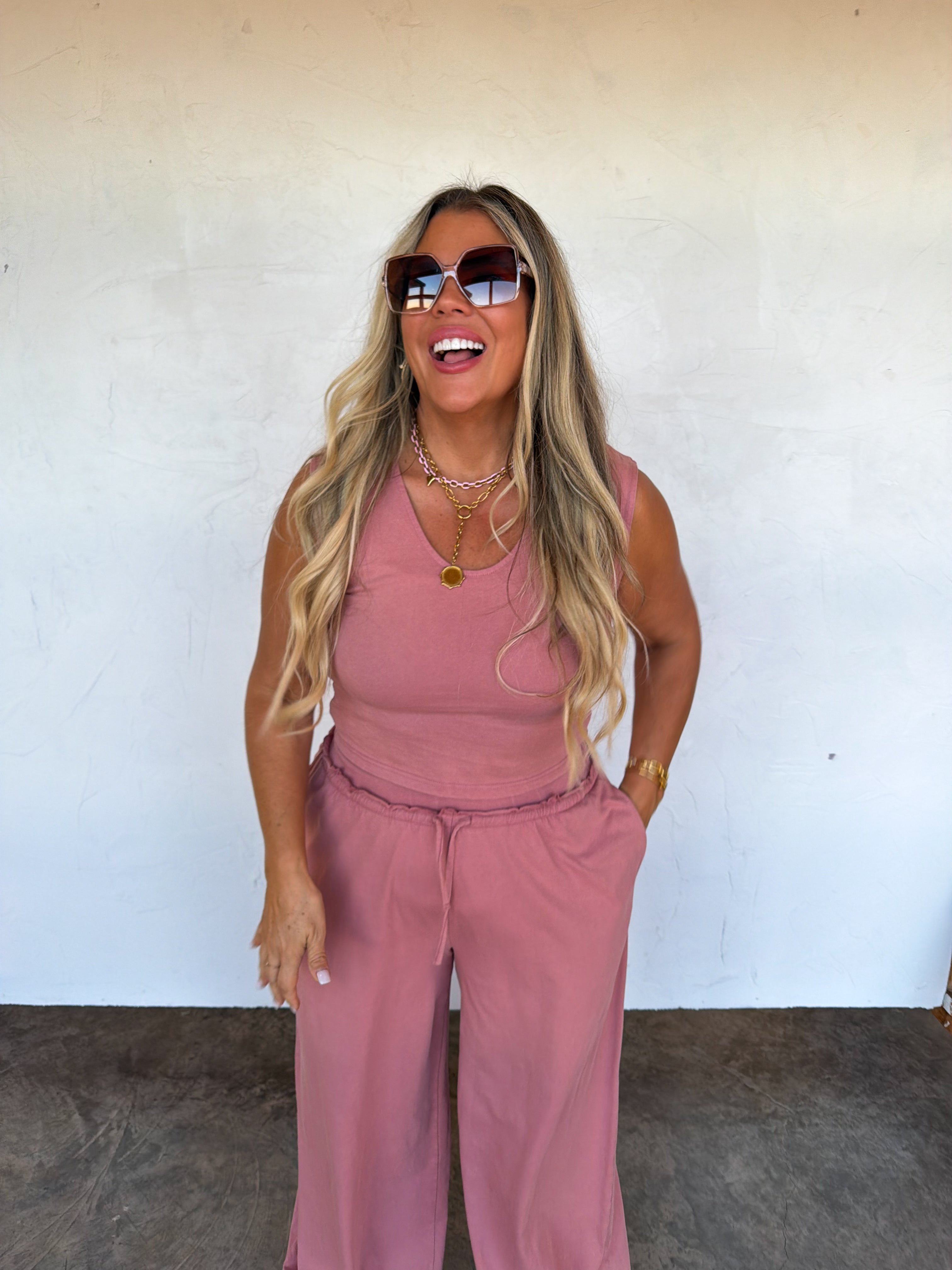This comfy sets are the SOFTEST and most comfortable thing to put on your body!! The cute v-neck tank style top features flattering slight capped sleeves with a perfect fitted look . Bottoms are relaxed fit, wide-leg and have raw seam detail hem on the waistline with an elastic waist and working drawstring . Pair this cute set with sneakers or slides for an easy, put-together look that’s as comfortable as it is chic.