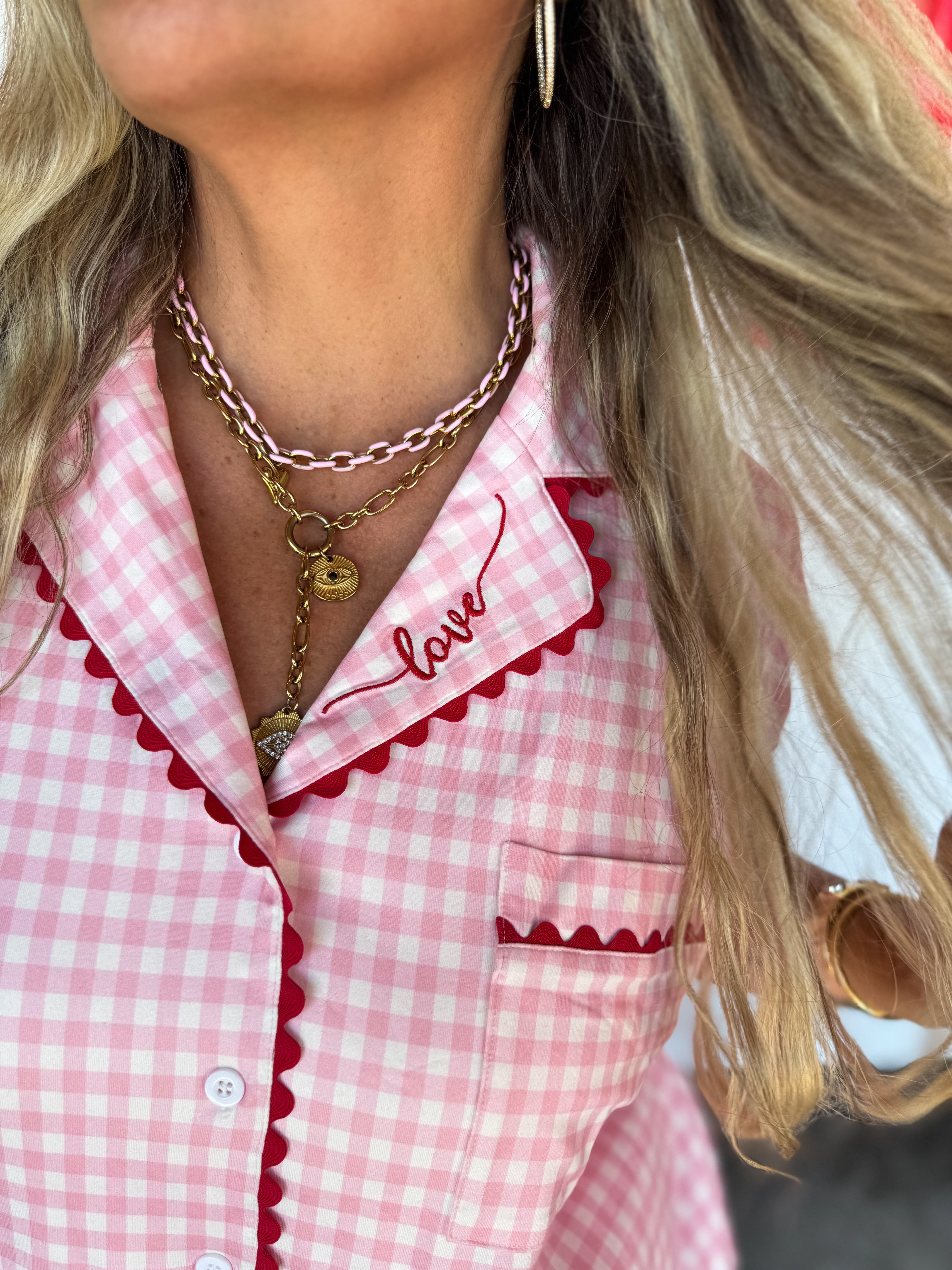 Our Luxe PJ Lounge sets are the perfect sleep set for both comfort and style. Features adorable ric-rac trim, and the cutest new embroidered "love" detail on the collar! Button-up top with short sleeves and matching PANTS, this cute new gingham design will keep you looking good while you relax. Ultra-soft, STRETCHY and lightweight for a relaxed feel. Pants have pockets and elastic waist.