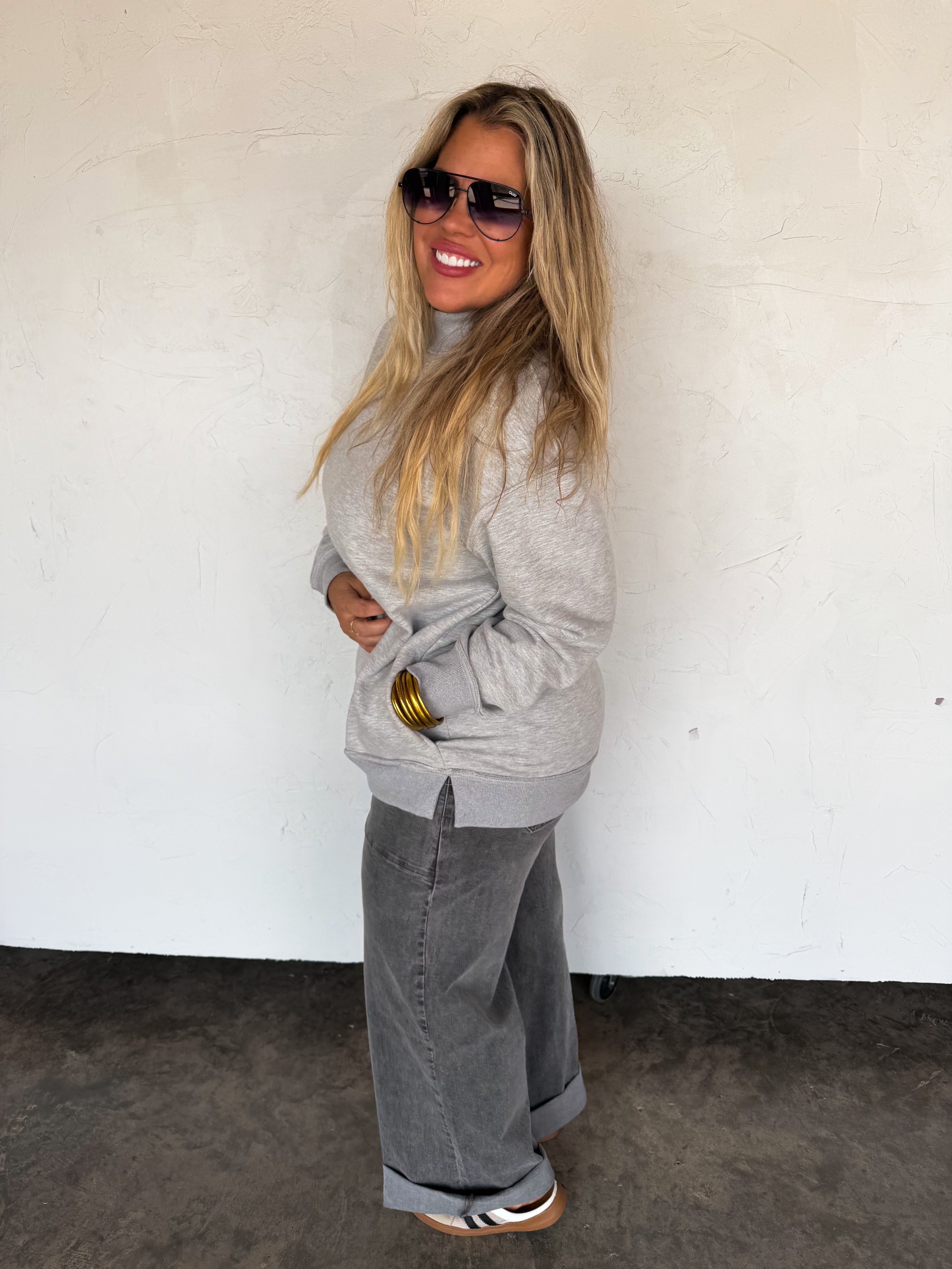 Stay cozy and cute in these oversized mock-neck sweatshirts! Made from soft, medium-weight fabric, they feature a relaxed fit with dropped shoulders, ribbed cuffs, and side slits for easy movement. Perfect with leggings or cutoffs, these bright, fun colors make them an everyday staple for lounging, errands, or travel.