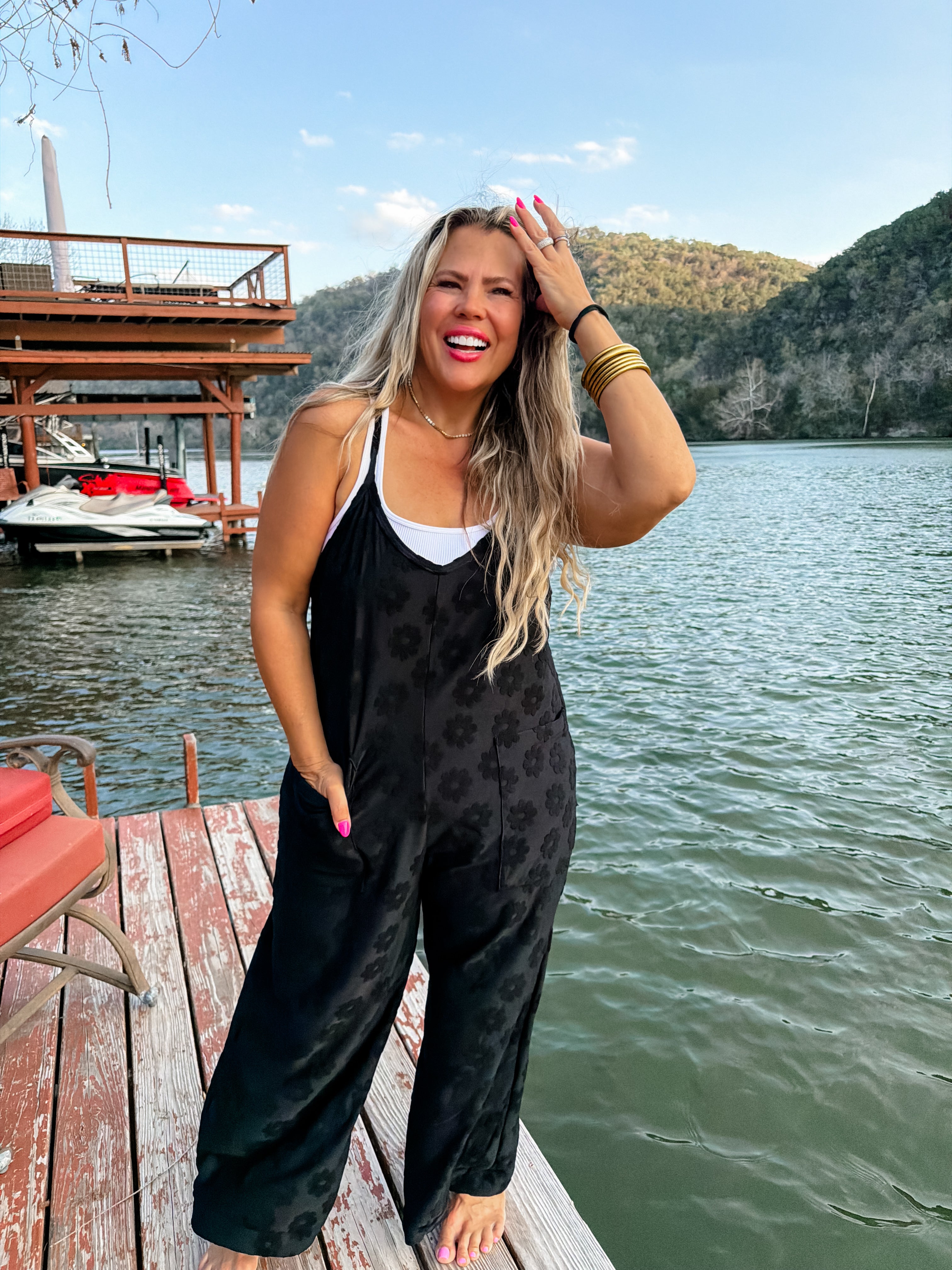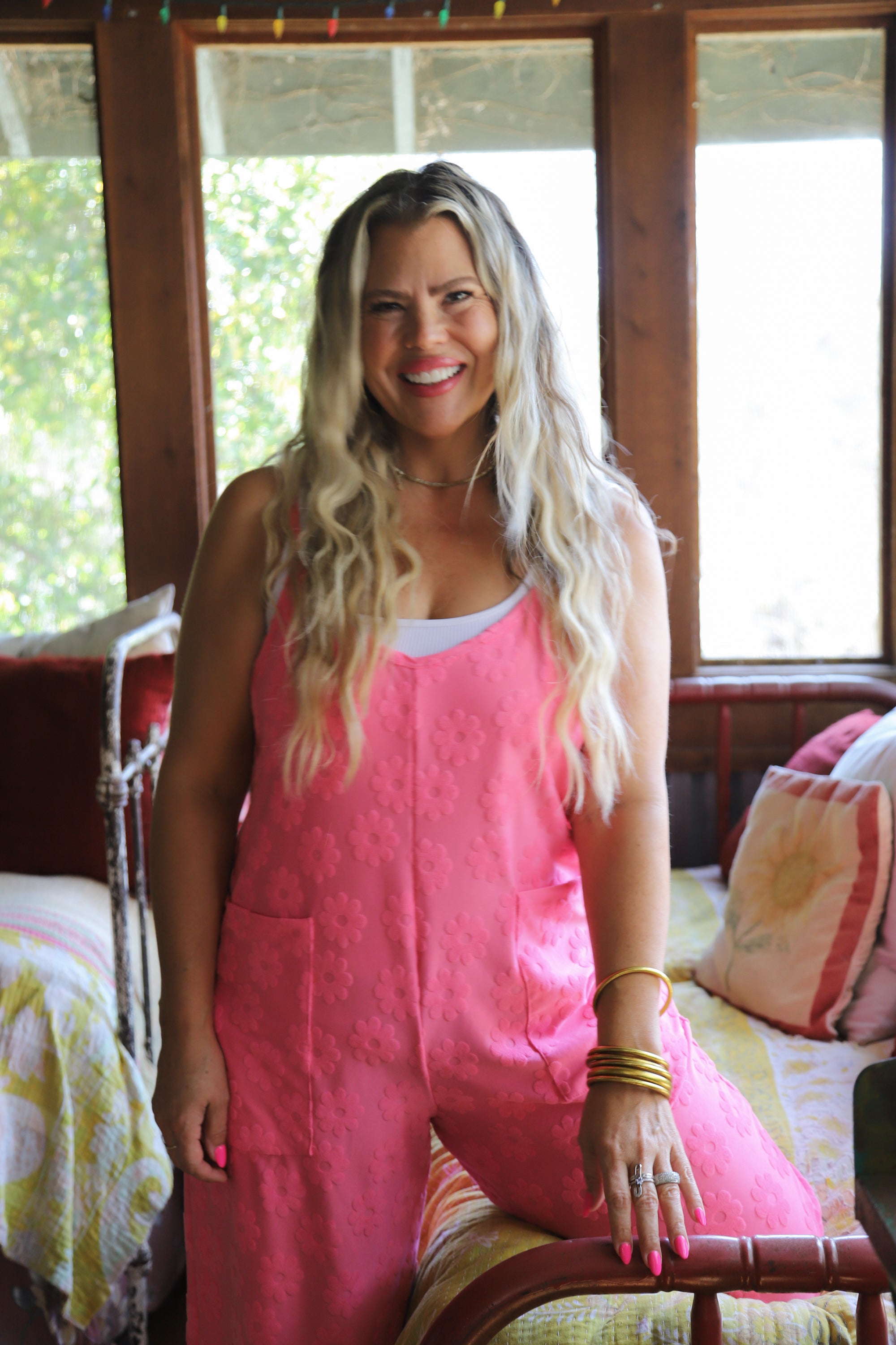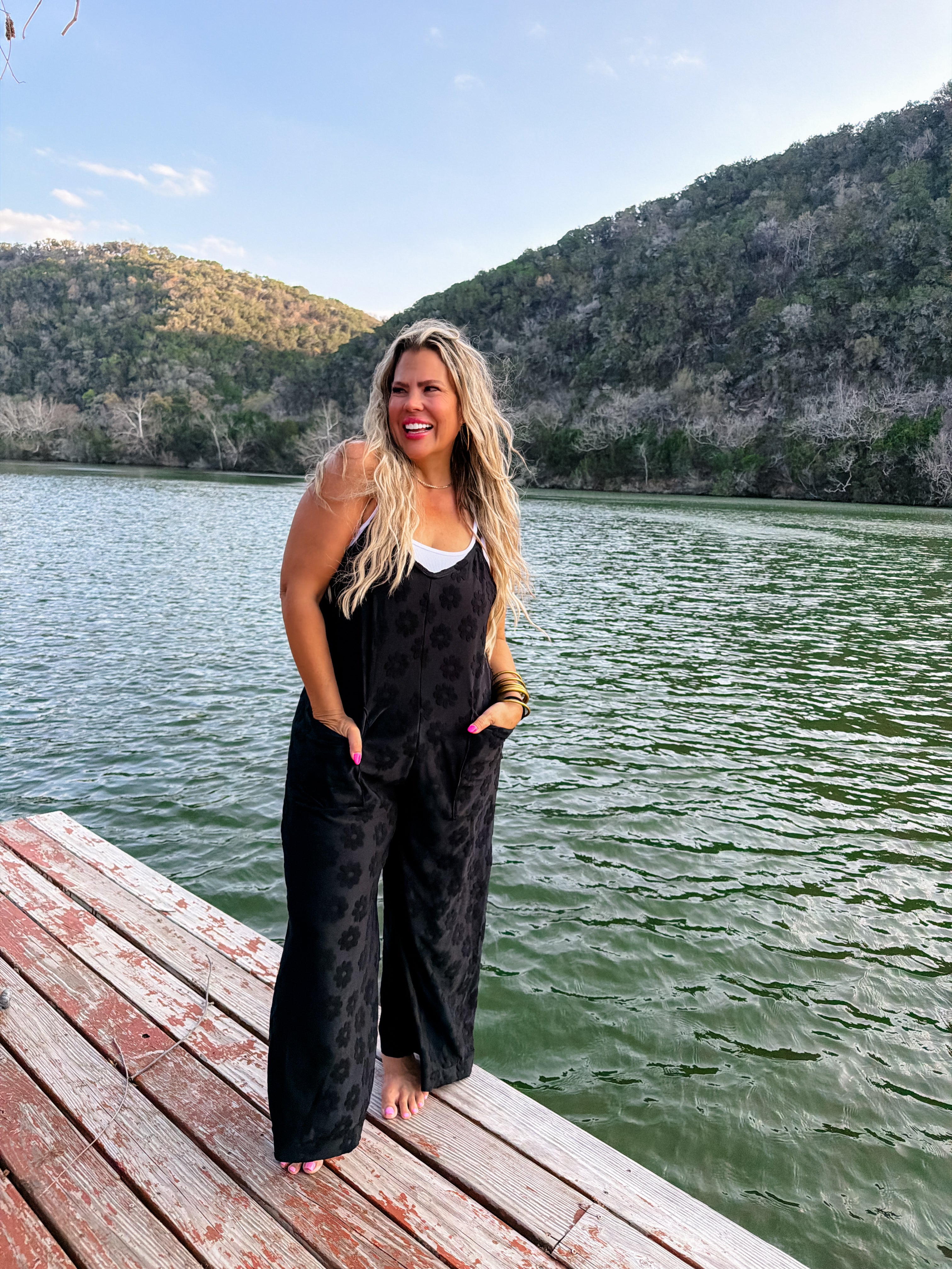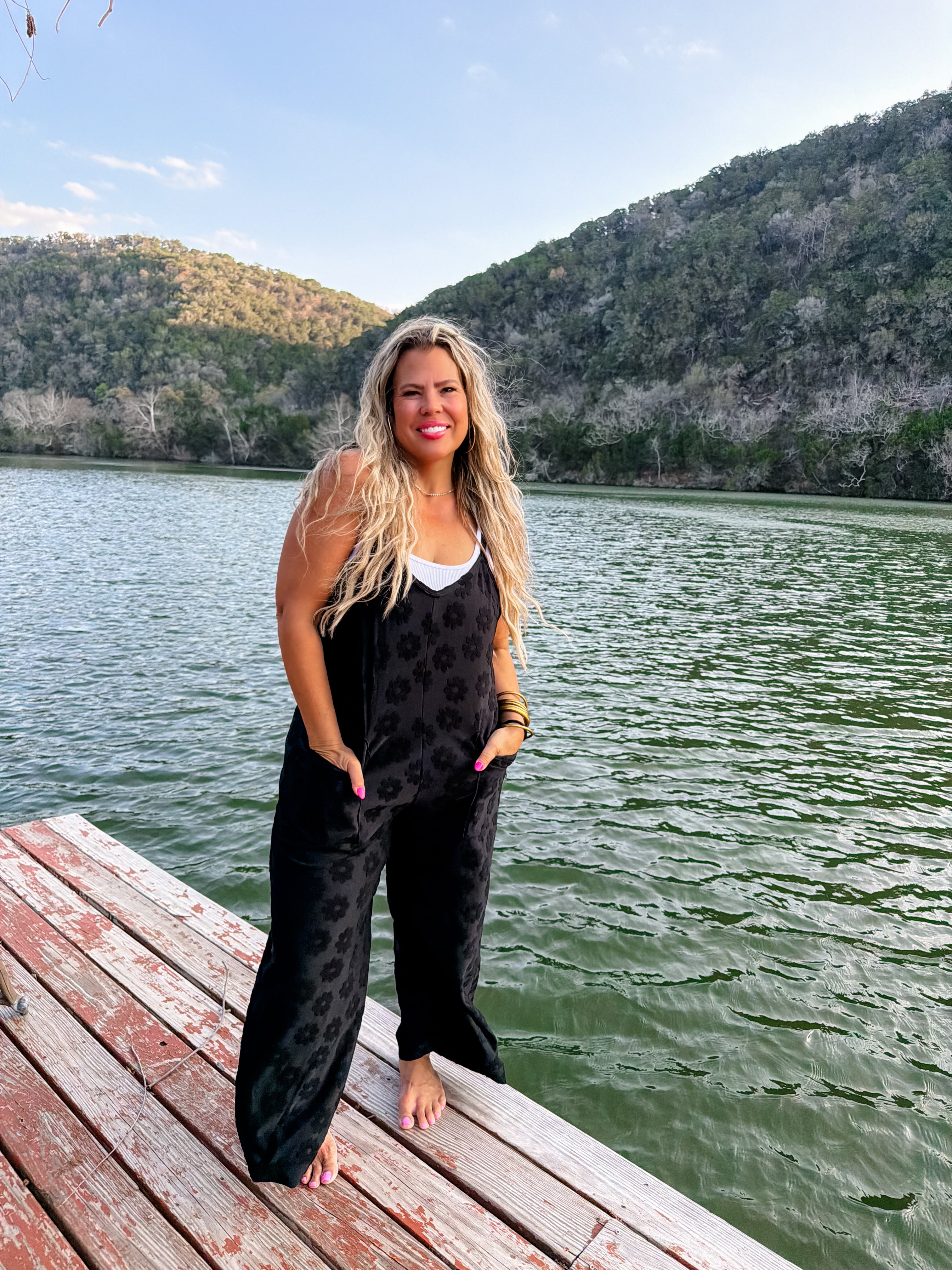 The cutest terry daisy romper! Features a deep V front, oversized front pockets, a semi crop length, wide legs and adjustable straps.