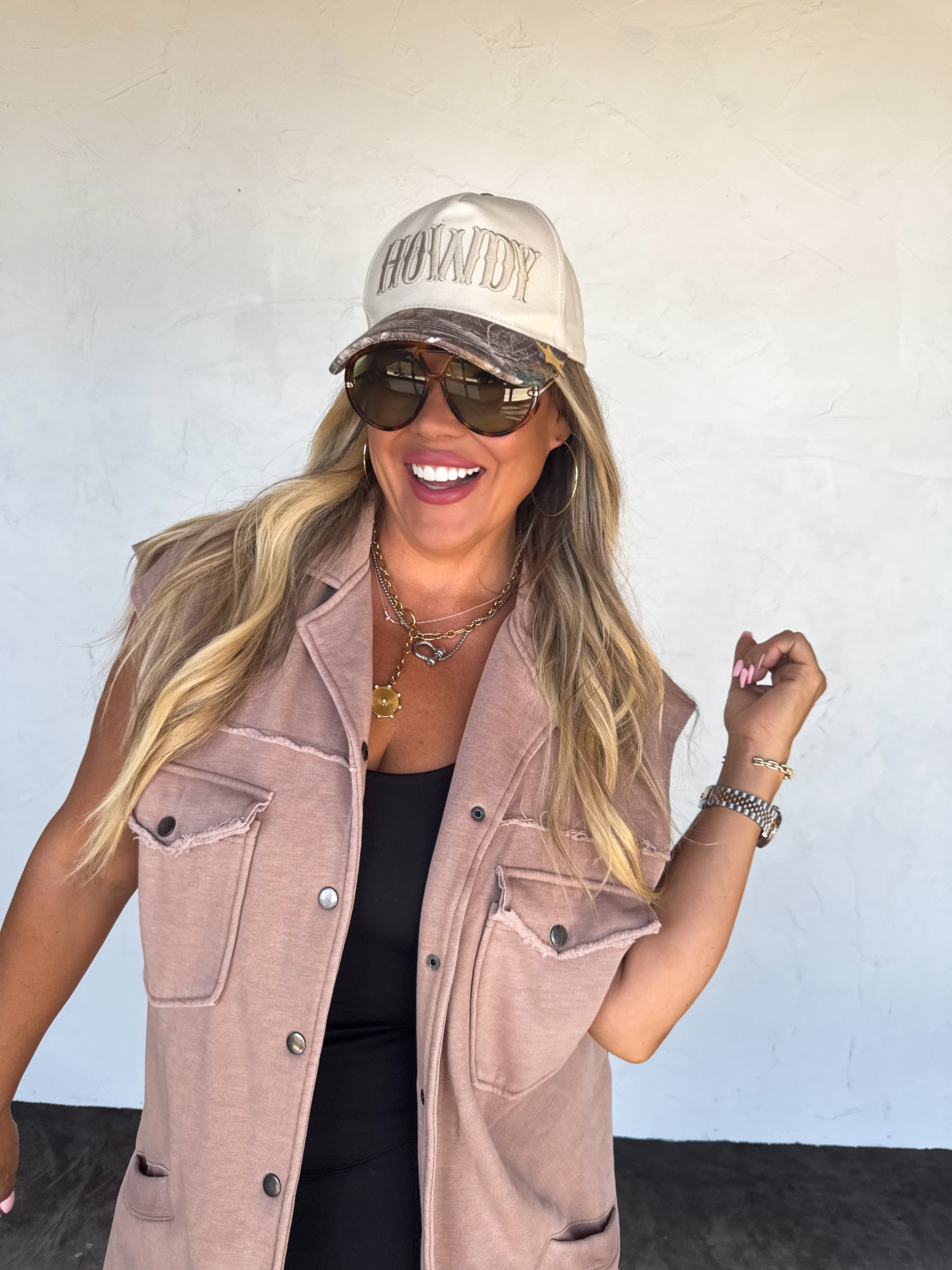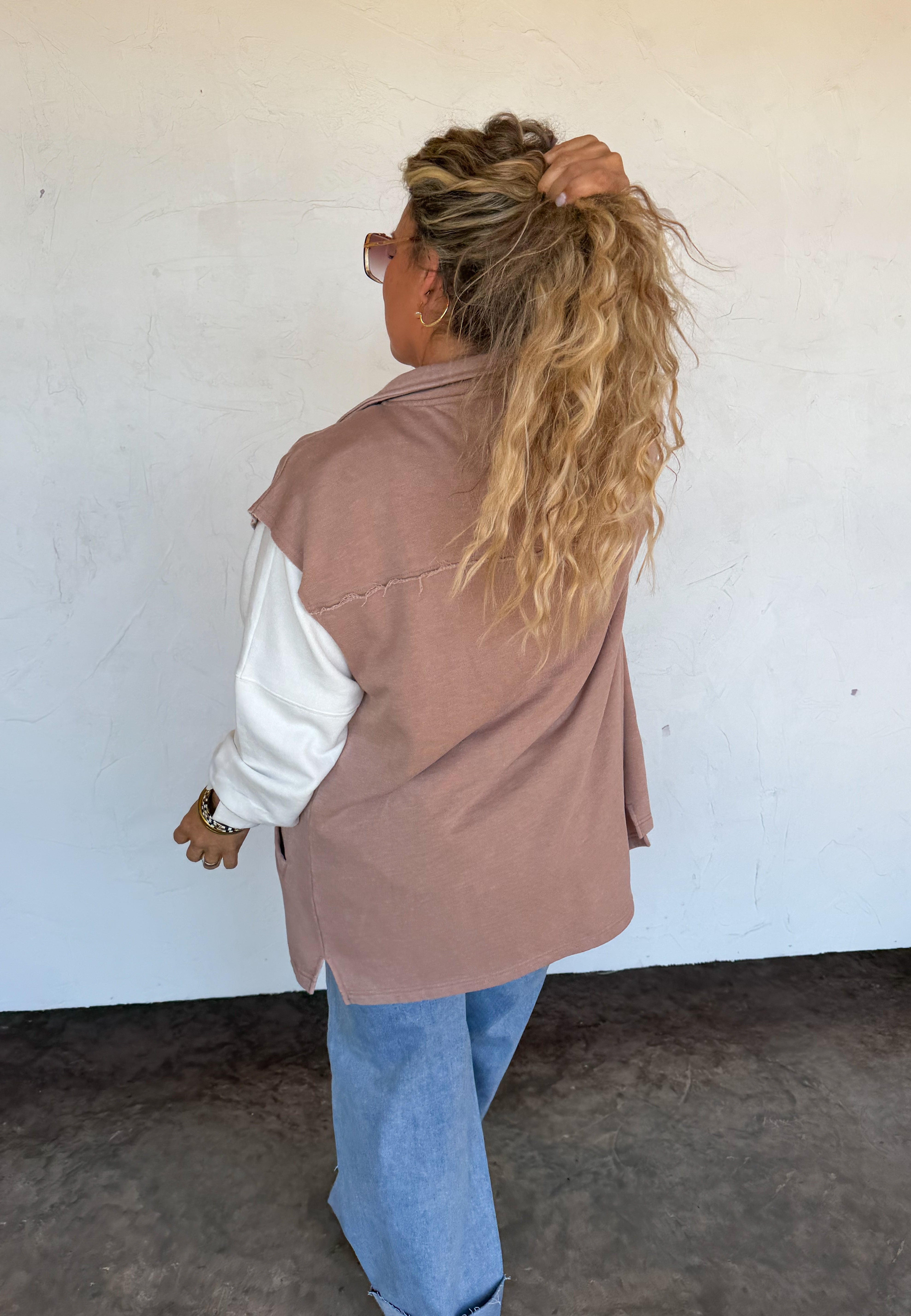 An easy, everyday layer with a relaxed fit and timeless utility style. The Hudson Utility Vest features a soft washed terry fabric, snap-button front with raw hem details, and functional front pockets. Designed in a neutral tone that pairs effortlessly with tees, sweaters, and denim for a laid-back, go-anywhere look.