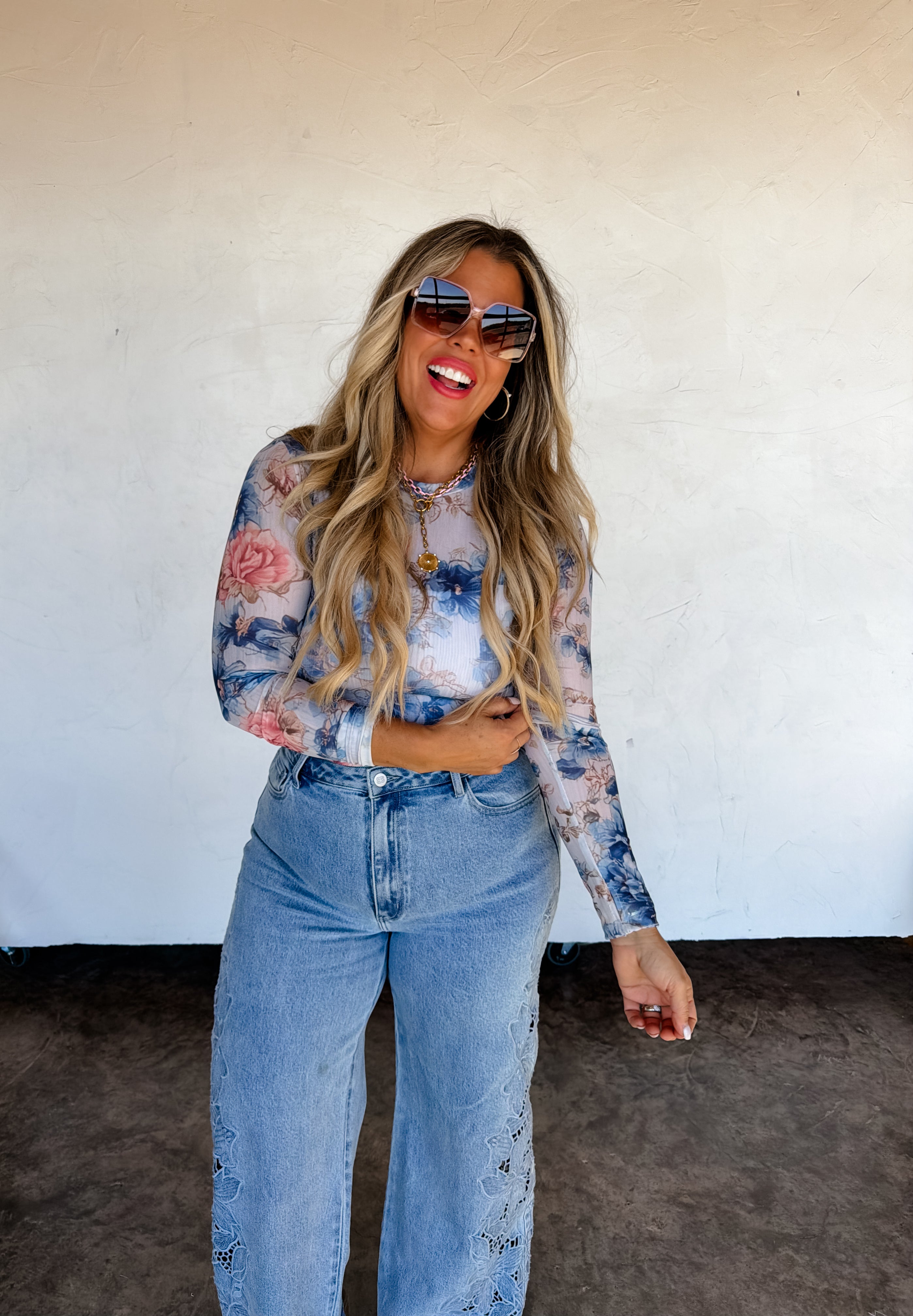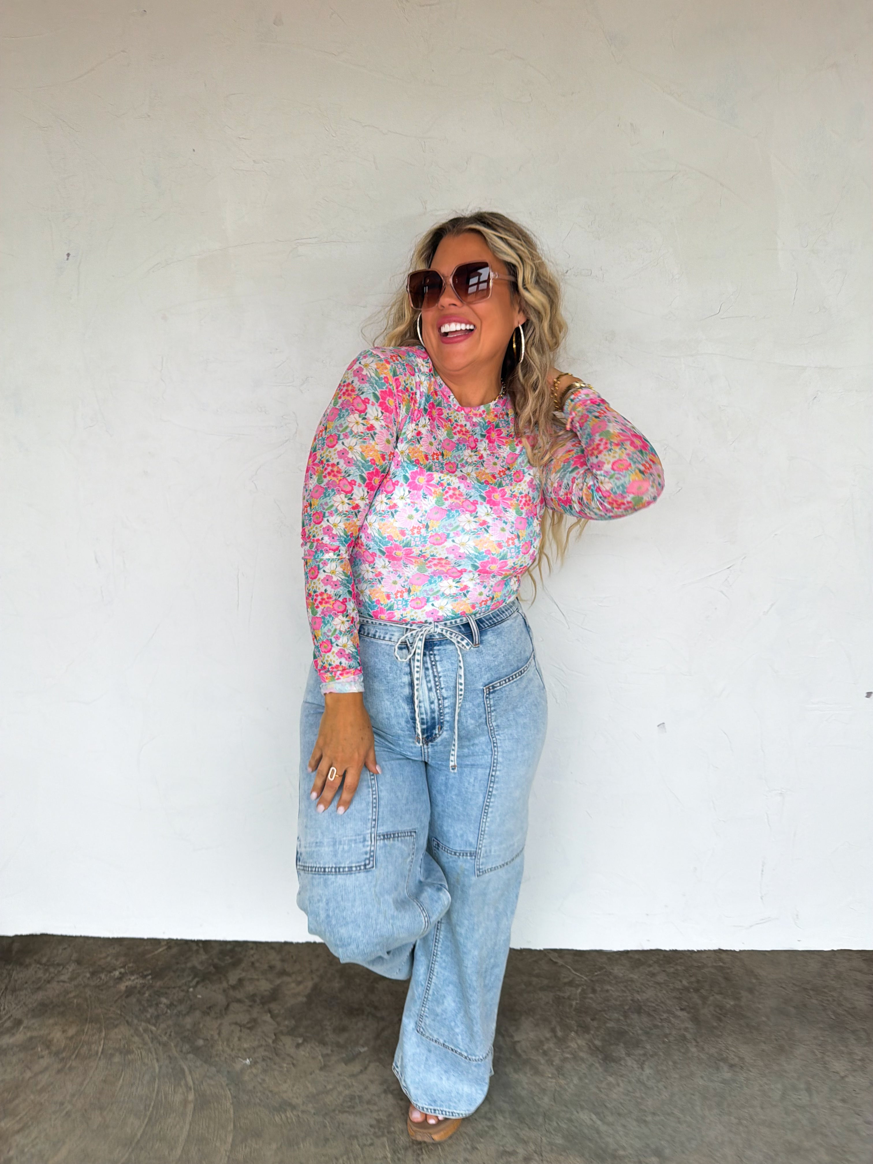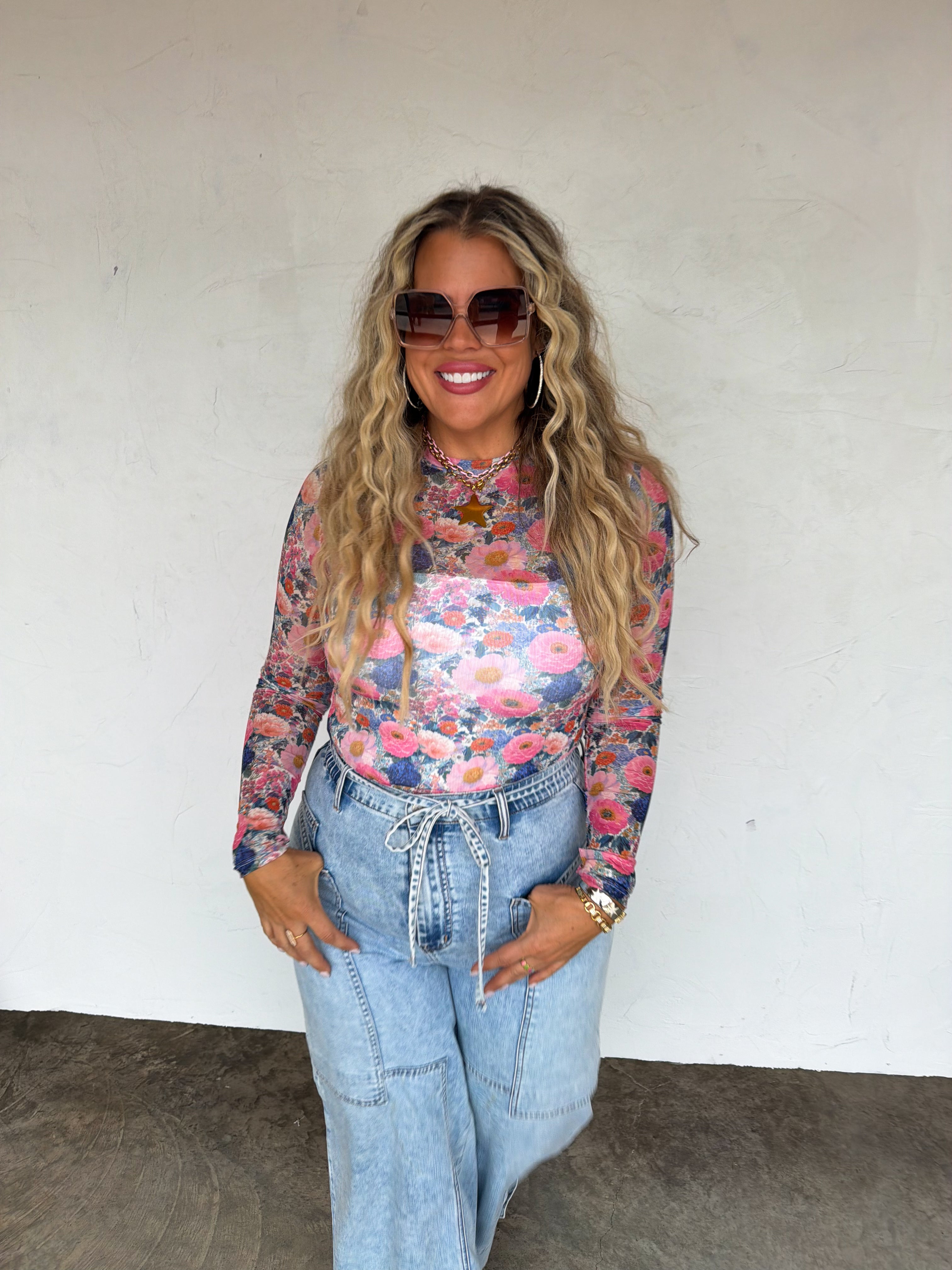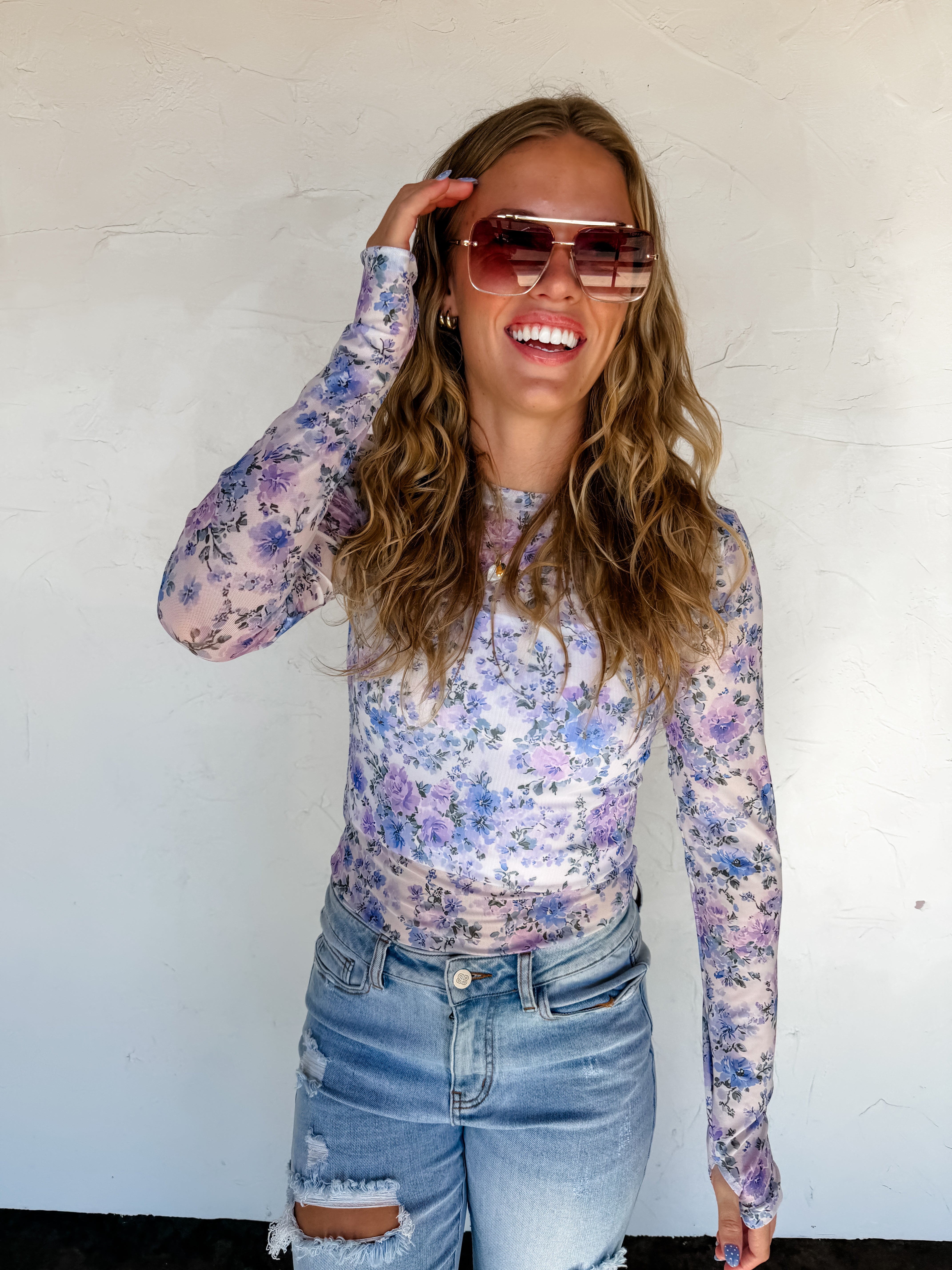 OUR SPRING PRINTS ARE HERE!! Super cute for layering, this sultry stretchy mesh print long-sleeve top features a totally sheer design. Perfect worn alone or paired under your favorite cardigan, vest or sweater! Crew neck and thumbhole details.